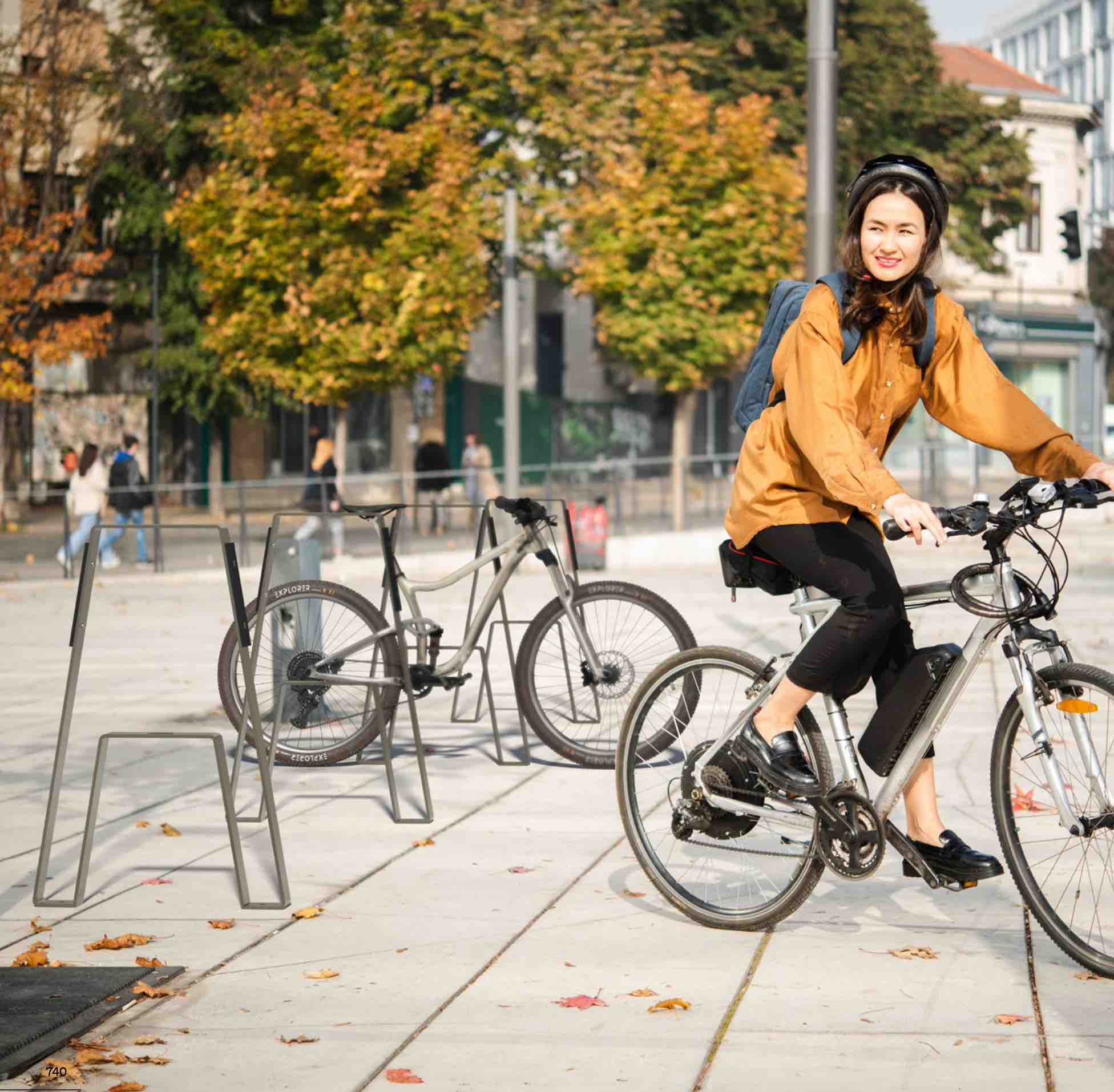 Perfecto para instalar junto a vitrinas y expositores informativos o en áreas equipadas con marquesinas urbanas de acero y cristal, este portabicicletas garantiza orden, protección y estilo en entornos públicos.