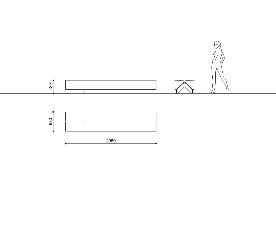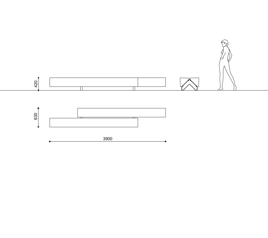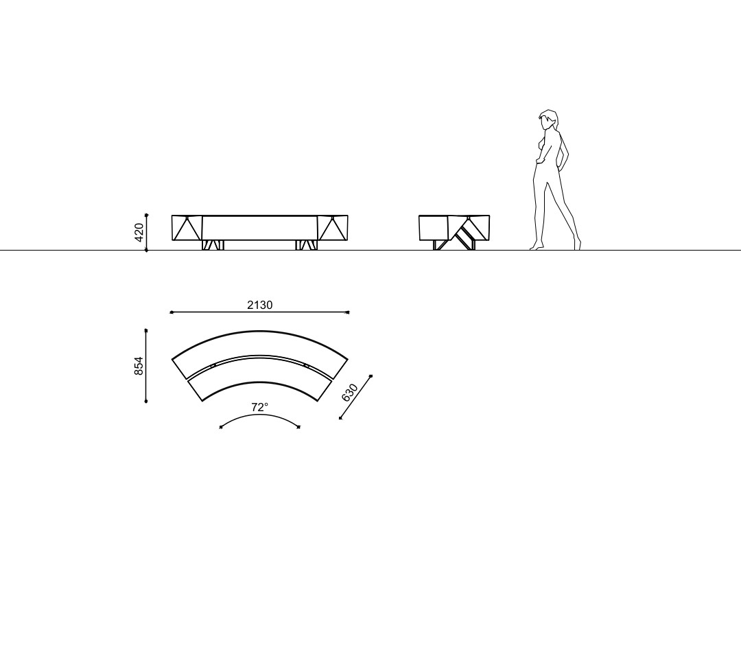 Listones de asiento con sección triangular, fabricados en HPC (High Performance Concrete) con acabado velluto liso a cassero, que aportan elegancia y durabilidad.