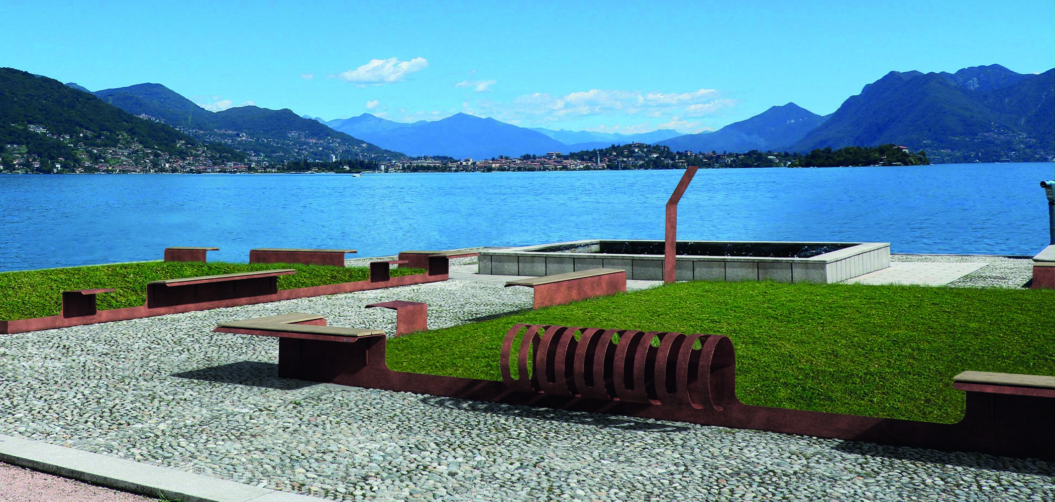 Asientos sin respaldo realizados con una única hoja de chapa moldeada en acero Corten.