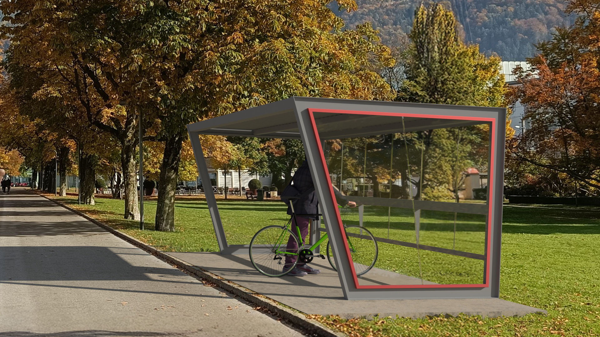 MARQUESINA DE ACERO CON PARED DE VIDRIO Y APARCABICICLETAS