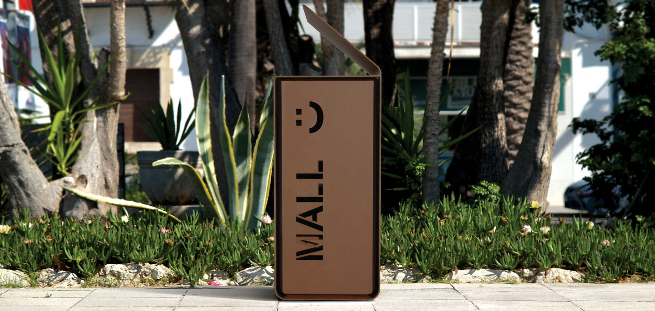 Su tapa superior, inclinada a 45°, protege el interior de la lluvia y facilita el uso, garantizando higiene y comodidad. Su diseño sobrio pero personalizable, con opción de corte láser decorativo en los laterales, permite su integración estética en todo tipo de entornos, desde parques y jardines hasta centros urbanos, paseos marítimos y campus universitarios.