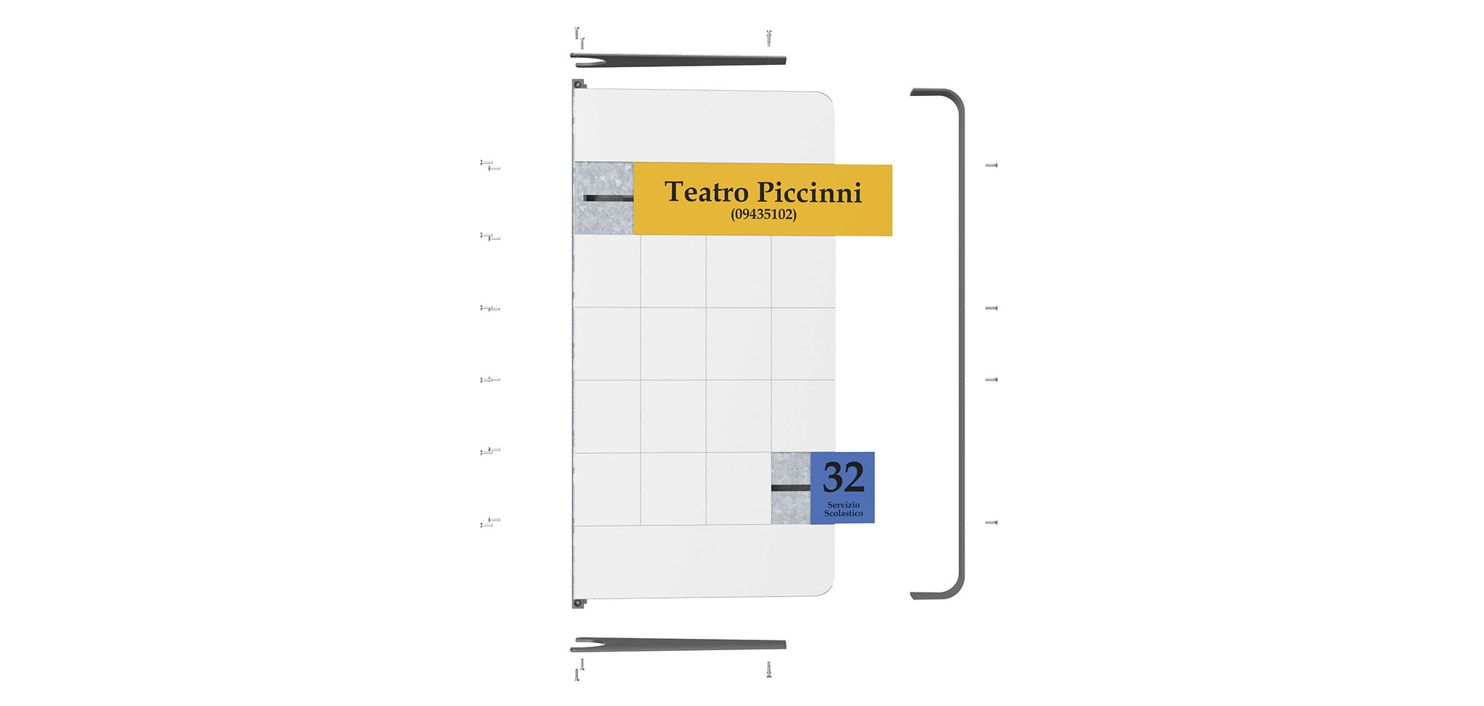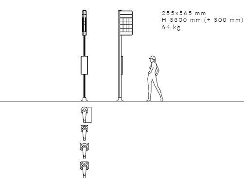 Su estructura está formada por un soporte vertical en extrusión de aluminio con un núcleo reforzado y base estética en acero, materiales que garantizan durabilidad, resistencia a la corrosión y una apariencia sobria y contemporánea. En la parte superior incorpora uno o varios paneles modulares de aluminio con bloques de información extraíbles, que pueden personalizarse mediante adhesivos, escritura pre-espaciada o serigrafía, facilitando la actualización de los contenidos de forma rápida y económica.